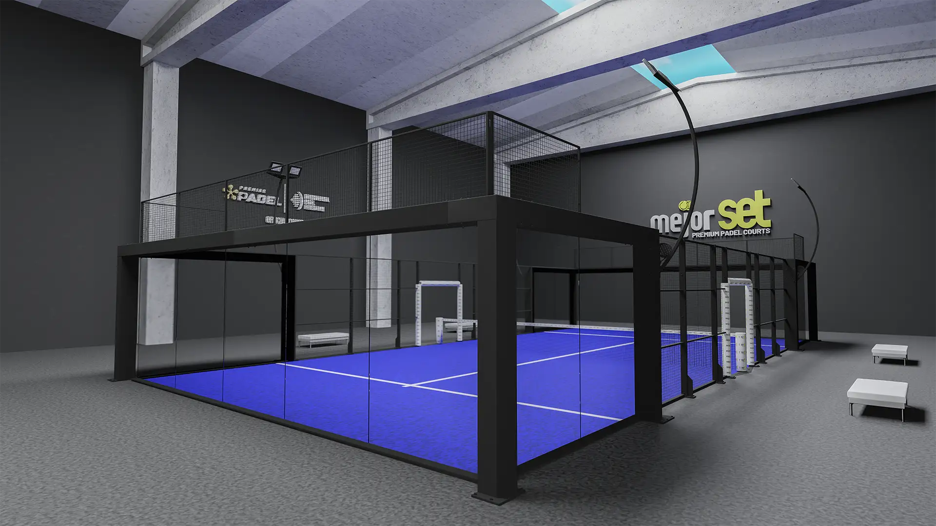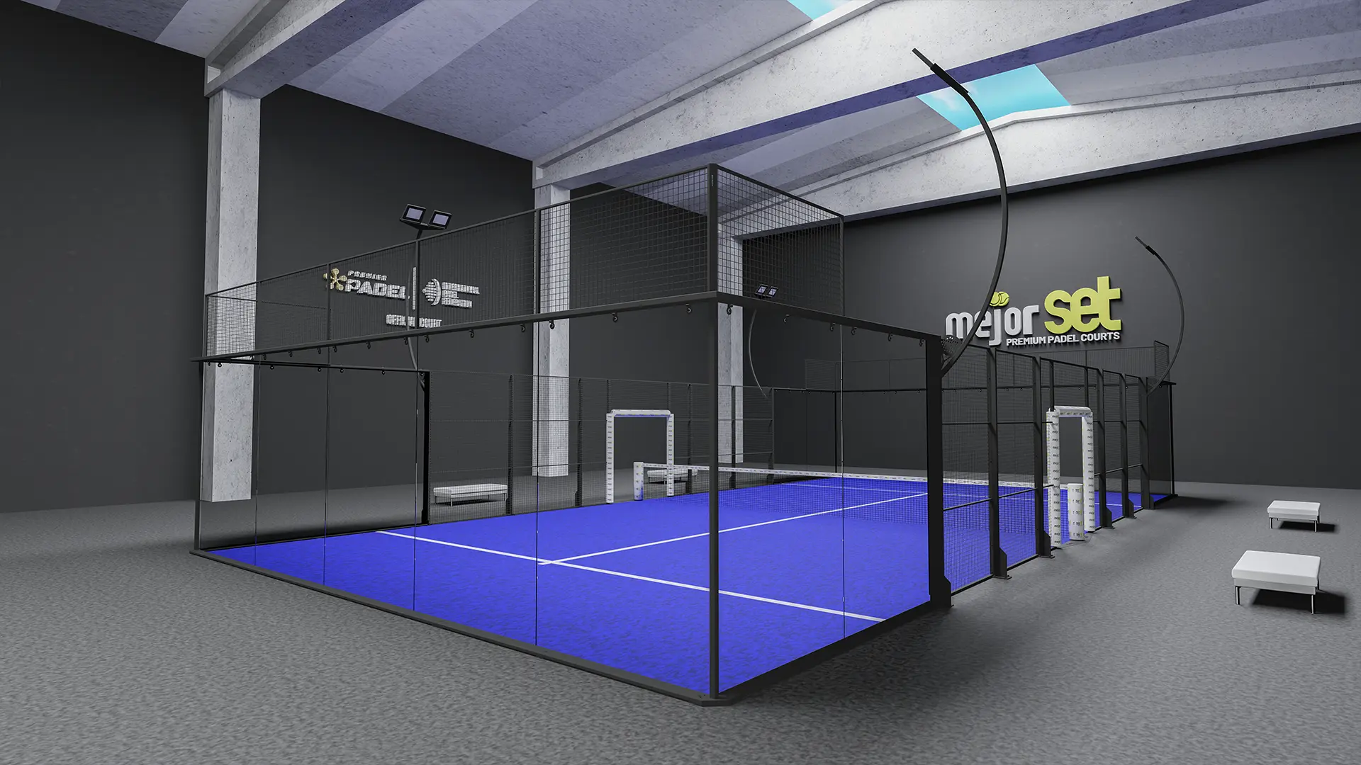 Ein einzigartiger vollständiger Panoramaplatz, neu gestaltet mit den Farben und dem Branding von Premier Padel.